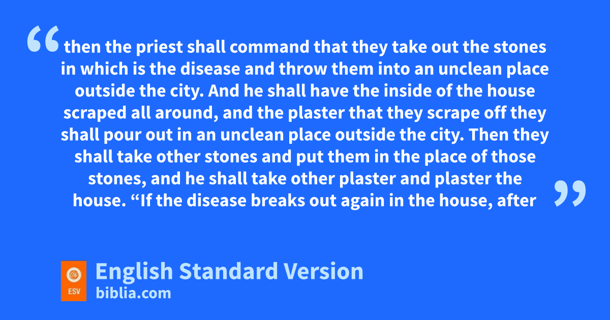 33 The Lord spoke to Moses and Aaron, saying, 34 “When you come into the land of Canaan, which I give you ufor a possession, and I put a case of leprous disease in a house in the land of your possession, 35 then he who owns the house shall come and tell the priest, ‘There seems to me to be some case of vdisease in my house.’ 36 Then the priest shall command that they empty the house before the priest goes to examine the disease, lest all that is in the house be declared unclean. And afterward the priest shall go in to see the house. 37 And he shall examine the disease. And if the disease is in the walls of the house with greenish or reddish spots, and if it appears to be deeper than the surface, 38 then the priest shall go out of the house to the door of the house and shut up the house seven days. 39 And the priest shall come again on the seventh day, and look. If the disease has spread in the walls of the house, 40 then the priest shall command that they take out the stones in which is the disease and throw them into an unclean place outside the city. 41 And he shall have the inside of the house scraped all around, and the plaster that they scrape off they shall pour out in an unclean place outside the city. 42 Then they shall take other stones and put them in the place of those stones, and he shall take other plaster and plaster the house.