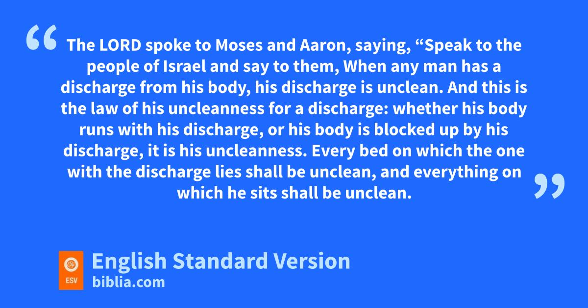 15 The Lord spoke to Moses and Aaron, saying, 2 “Speak to the people of Israel and say to them, hWhen any man has a discharge from his body,1 his discharge is unclean. 3 And this is the law of his uncleanness for a discharge: whether his body runs with his discharge, or his body is blocked up by his discharge, it is his uncleanness. 4 Every bed on which the one with the discharge lies shall be unclean, and everything on which he sits shall be unclean. 5 And anyone who touches his bed ishall wash his clothes and jbathe himself in water and be unclean until the evening. 6 And whoever sits on anything on which the one with the discharge has sat shall wash his clothes and bathe himself in water and be unclean until the evening. 7 And whoever touches the body of the one with the discharge shall wash his clothes and bathe himself in water and be unclean until the evening. 8 And if the one with the discharge spits on someone who is clean, then he shall wash his clothes and bathe himself in water and be unclean until the evening. 9 And any saddle on which the one with the discharge rides shall be unclean. 10 And whoever touches anything that was under him shall be unclean until the evening. And whoever carries such things shall wash his clothes and bathe himself in water and be unclean until the evening. 11 Anyone whom the one with the discharge touches without having rinsed his hands in water shall wash his clothes and bathe himself in water and be unclean until the evening. 12 And an kearthenware vessel that the one with the discharge touches shall be broken, and every vessel of wood shall be rinsed in water.