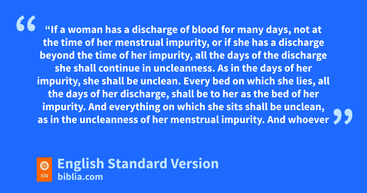 25 “If ta woman has a discharge of blood for many days, not at the time of her menstrual impurity, or if she has a discharge beyond the time of her impurity, all the days of the discharge she shall continue in uncleanness. As in the days of her impurity, she shall be unclean. 26 Every bed on which she lies, all the days of her discharge, shall be to her as the bed of her impurity. And everything on which she sits shall be unclean, as in the uncleanness of her menstrual impurity. 27 And whoever touches these things shall be unclean, and shall wash his clothes and bathe himself in water and be unclean until the evening. 28 But uif she is cleansed of her discharge, she shall count for herself seven days, and after that she shall be clean. 29 And on the eighth day she shall take two vturtledoves or two pigeons and bring them to the priest, to the entrance of the tent of meeting. 30 And the priest shall use one for a sin offering and the other for a burnt offering. And the priest shall make atonement for her before the Lord for her unclean discharge.