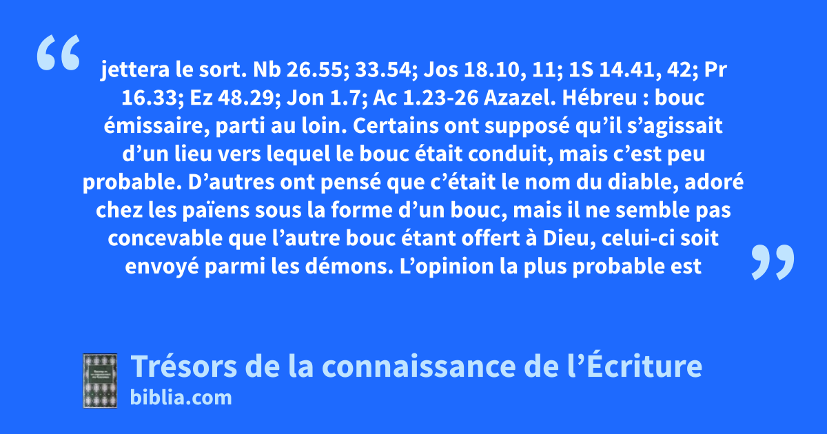 jettera le sort. Nb 26.55; 33.54; Jos 18.10, 11; 1S 14.41, 42; Pr 16.33; Ez 48.29; Jon 1.7; Ac 1.23-26 Azazel. Hébreu : bouc émissaire, parti au loin. Certains ont supposé qu’il s’agissait d’un lieu vers lequel le bouc était conduit, mais c’est peu probable. D’autres ont pensé que c’était le nom du diable, adoré chez les païens sous la forme d’un bouc, mais il ne semble pas concevable que l’autre bouc étant offert à Dieu, celui-ci soit envoyé parmi les démons. L’opinion la plus probable est que c’est le nom donné au bouc, qui est envoyé au loin, que la Vulgate appelle {emissarius}.