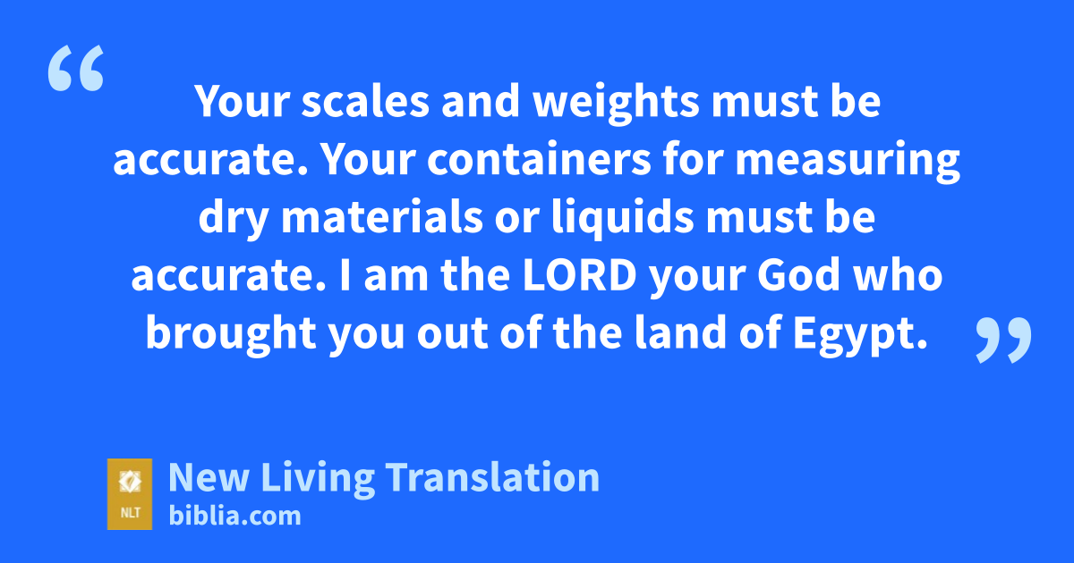 35 “Do not use dishonest standards when measuring length, weight, or volume. 36 Your scales and weights must be accurate. Your containers for measuring dry materials or liquids must be accurate.* I am the Lord your God who brought you out of the land of Egypt.