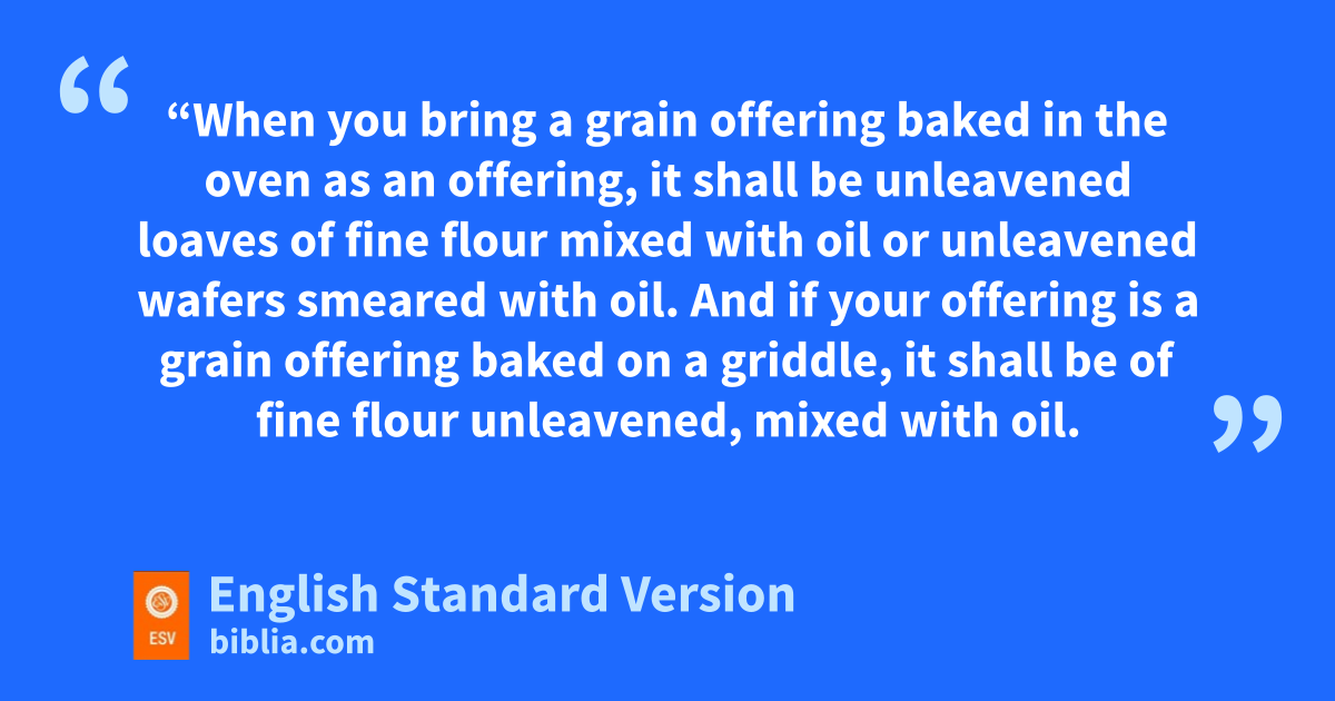 4 “When you bring a grain offering baked in the oven as an offering, it shall be vunleavened loaves of fine flour mixed with oil or unleavened wafers smeared with oil. 5 And if your offering is a grain offering wbaked on a griddle, it shall be of fine flour unleavened, mixed with oil. 6 You shall break it in pieces and pour oil on it; it is a grain offering. 7 And if your offering is a grain offering cooked in a pan, it shall be made of fine flour with oil. 8 And you shall bring the grain offering that is made of these things to the Lord, and when it is presented to the priest, he shall bring it to the altar. 9 And the priest shall take from the grain offering its memorial portion and burn this on the altar, a food xoffering with a ypleasing aroma to the Lord. 10 But the zrest of the grain offering shall be for Aaron and his sons; zit is a most holy part of the Lord’s food offerings.