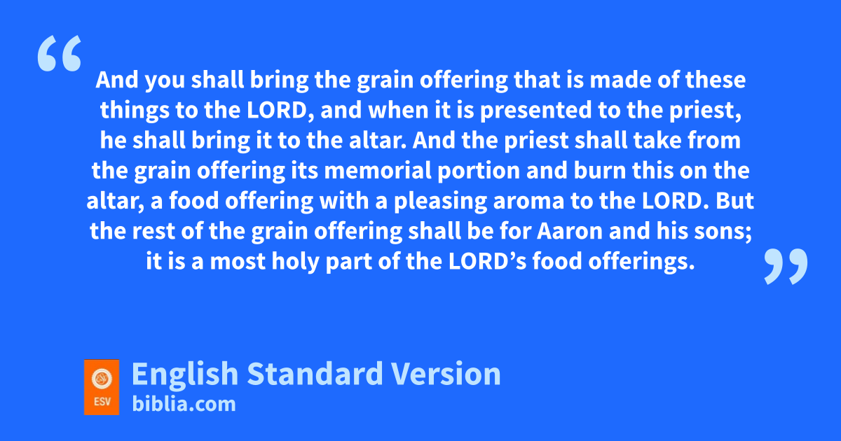 2 “When anyone brings a pgrain offering as an offering to the Lord, his offering shall be of fine flour. qHe shall pour oil on it and put frankincense on it 2 and bring it to Aaron’s sons the priests. And he shall take from it a handful of the fine flour and oil, with all of its frankincense, and the priest shall burn this as its rmemorial portion on the altar, a food soffering with a pleasing aroma to the Lord. 3 But the trest of the grain offering shall be for Aaron and his sons; uit is a most holy part of the Lord’s food offerings.
