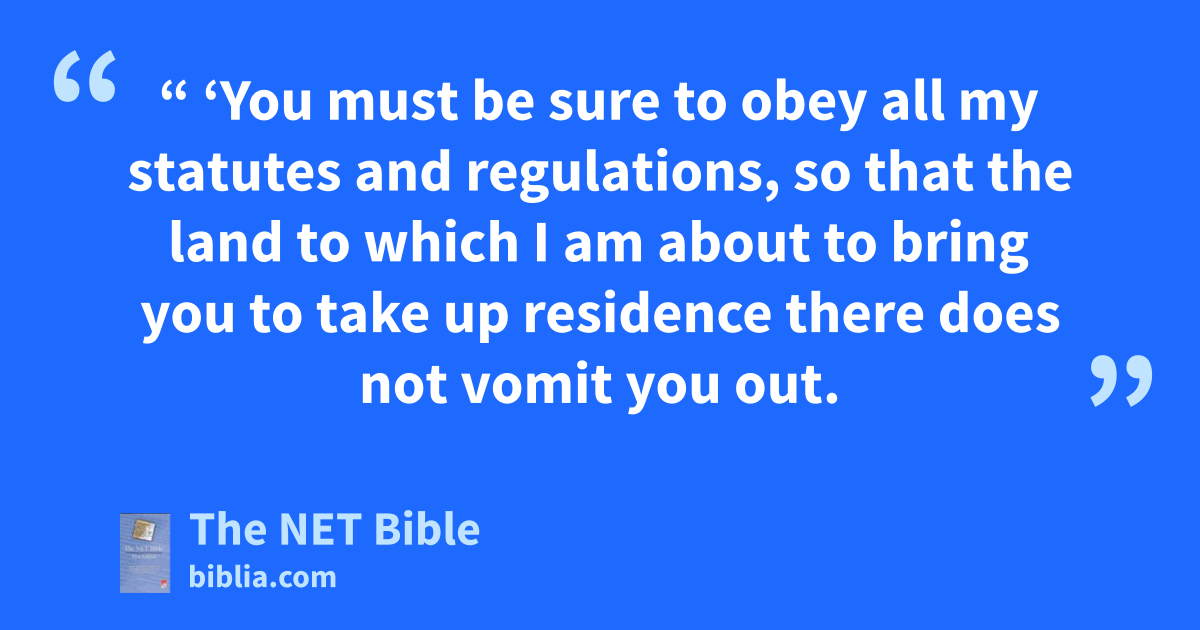 20:22 “ ‘You must be sure to obey all my statutes and regulations,39 so that40 the land to which I am about to bring you to take up residence there does not vomit you out. 20:23 You must not walk in the statutes of the nation41 which I am about to drive out before you, because they have done all these things and I am filled with disgust against them. 20:24 So I have said to you: You yourselves will possess their land and I myself will give it to you for a possession, a land flowing with milk and honey. I am the Lord your God who has set you apart from the other peoples.42 20:25 Therefore you must distinguish43 between the clean animal and the unclean, and between the unclean bird and the clean, and you must not make yourselves detestable by means of an animal or bird or anything that creeps on the ground—creatures44 I have distinguished for you as unclean.45 20:26 You must be holy to me because I, the Lord, am holy, and I have set you apart from the other peoples to be mine.