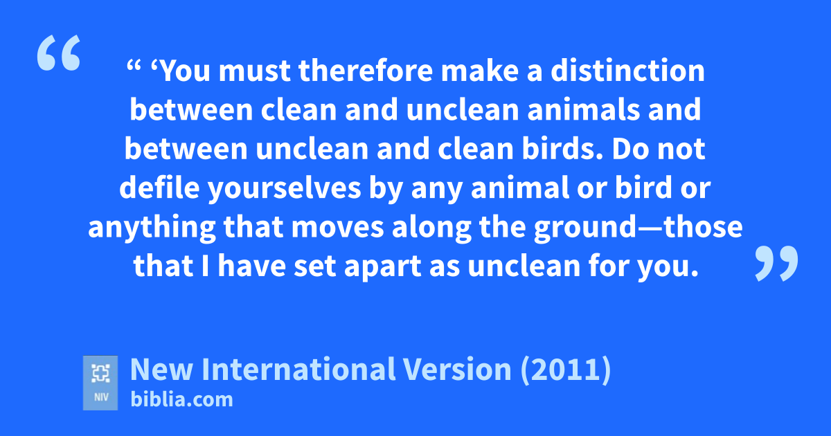 25 “ ‘You must therefore make a distinction between clean and unclean animals and between unclean and clean birds.u Do not defile yourselves by any animal or bird or anything that moves along the ground—those that I have set apart as unclean for you. 26 You are to be holy to mev because I, the Lord, am holy,w and I have set you apart from the nationsx to be my own.