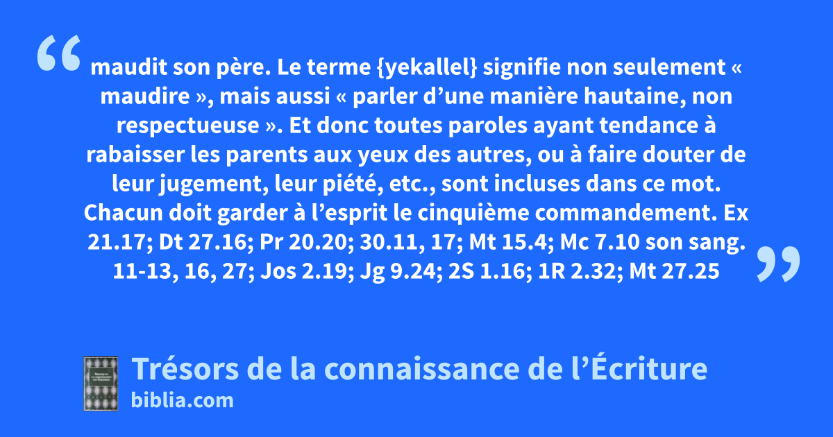 maudit son père. Le terme {yekallel} signifie non seulement « maudire », mais aussi « parler d’une manière hautaine, non respectueuse ». Et donc toutes paroles ayant tendance à rabaisser les parents aux yeux des autres, ou à faire douter de leur jugement, leur piété, etc., sont incluses dans ce mot. Chacun doit garder à l’esprit le cinquième commandement. Ex 21.17; Dt 27.16; Pr 20.20; 30.11, 17; Mt 15.4; Mc 7.10 son sang. 11-13, 16, 27; Jos 2.19; Jg 9.24; 2S 1.16; 1R 2.32; Mt 27.25
