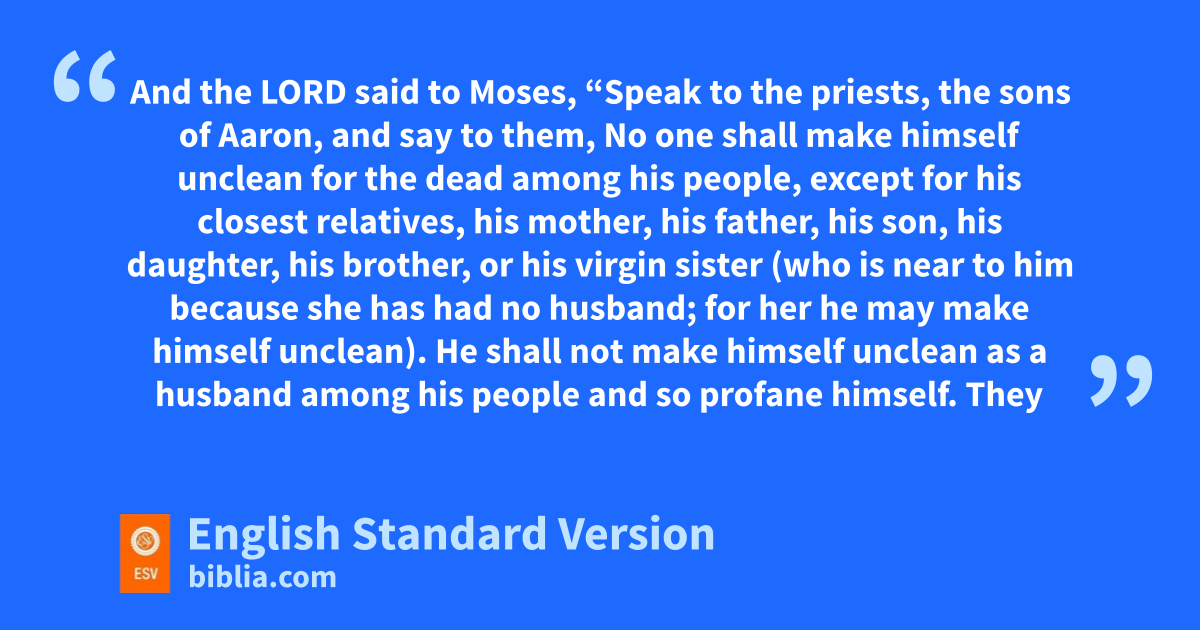 21 And the Lord said to Moses, “Speak to the priests, the sons of Aaron, and say to them, aNo one shall make himself unclean for the dead among his people, 2 except for his closest relatives, his mother, his father, his son, his daughter, his brother, 3 or his virgin sister (who is near to him because she has had no husband; for her he may make himself unclean). 4 He shall not make himself unclean as a husband among his people and so profane himself. 5 bThey shall not make bald patches on their heads, nor shave off the edges of their beards, nor make any cuts on their body. 6 They shall be holy to their God and cnot profane the name of their God. For they offer the Lord’s food offerings, dthe bread of their God; therefore they shall be holy. 7 eThey shall not marry a prostitute or a woman who has been defiled, neither shall they marry a woman fdivorced from her husband, for the priest is holy to his God. 8 You shall sanctify him, for he offers the bread of your God. He shall be holy to you, for gI, the Lord, who sanctify you, ham holy. 9 And the daughter of any priest, if she profanes herself by whoring, profanes her father; ishe shall be burned with fire.