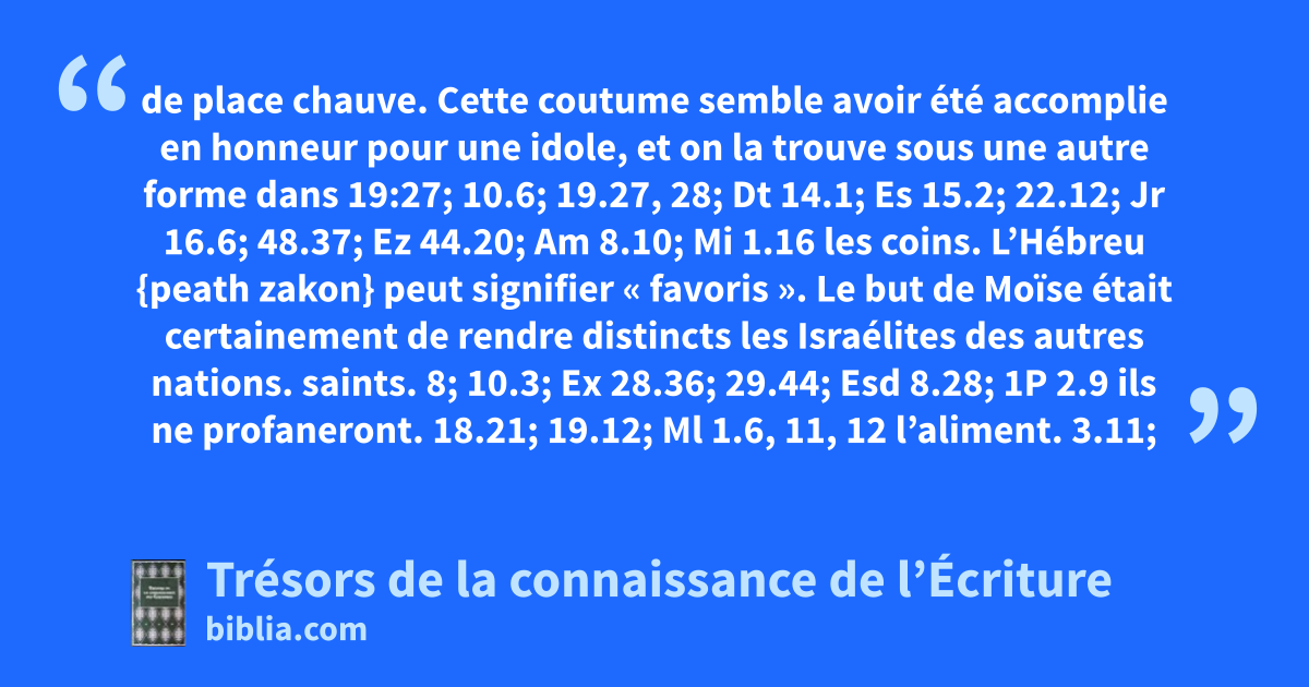 de place chauve. Cette coutume semble avoir été accomplie en honneur pour une idole, et on la trouve sous une autre forme dans 19:27; 10.6; 19.27, 28; Dt 14.1; Es 15.2; 22.12; Jr 16.6; 48.37; Ez 44.20; Am 8.10; Mi 1.16 les coins. L’Hébreu {peath zakon} peut signifier « favoris ». Le but de Moïse était certainement de rendre distincts les Israélites des autres nations.