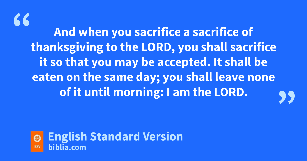 26 And the Lord spoke to Moses, saying, 27 g“When an ox or sheep or goat is born, it shall remain seven days with its mother, and from the eighth day on it shall be acceptable as a food offering to the Lord. 28 But you shall not kill an ox or a sheep hand her young in one day. 29 And when you sacrifice a isacrifice of thanksgiving to the Lord, you shall sacrifice it so that you may be accepted. 30 It shall be eaten on the same day; jyou shall leave none of it until morning: I am the Lord.