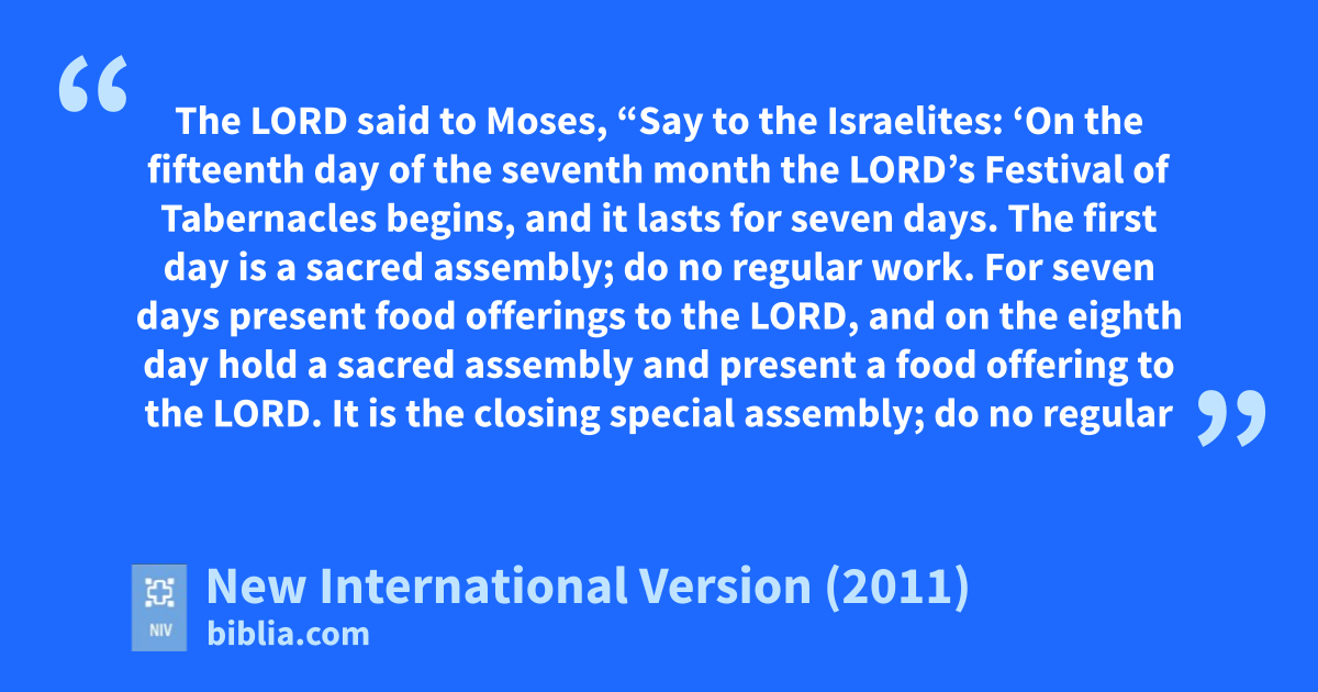 33 The Lord said to Moses, 34 “Say to the Israelites: ‘On the fifteenth day of the seventhz month the Lord’s Festival of Tabernaclesa begins, and it lasts for seven days. 35 The first day is a sacred assembly;b do no regular work.c 36 For seven days present food offerings to the Lord, and on the eighth day hold a sacred assemblyd and present a food offering to the Lord.e It is the closing special assembly; do no regular work.
