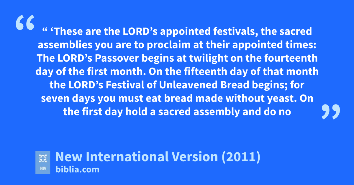4 “ ‘These are the Lord’s appointed festivals, the sacred assemblies you are to proclaim at their appointed times:f 5 The Lord’s Passoverg begins at twilight on the fourteenth day of the first month.h 6 On the fifteenth day of that month the Lord’s Festival of Unleavened Breadi begins; for seven daysj you must eat bread made without yeast. 7 On the first day hold a sacred assemblyk and do no regular work. 8 For seven days present a food offering to the Lord.l And on the seventh day hold a sacred assembly and do no regular work.’ ”