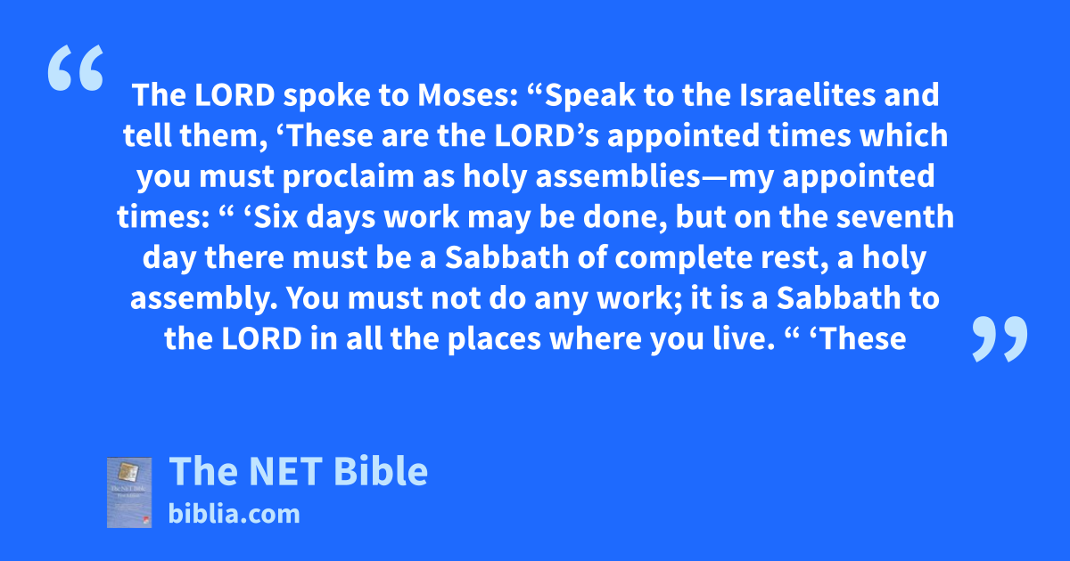 23:1 The Lord spoke to Moses: 23:2 “Speak to the Israelites and tell them, ‘These are the Lord’s appointed times which you must proclaim as holy assemblies—my appointed times:1