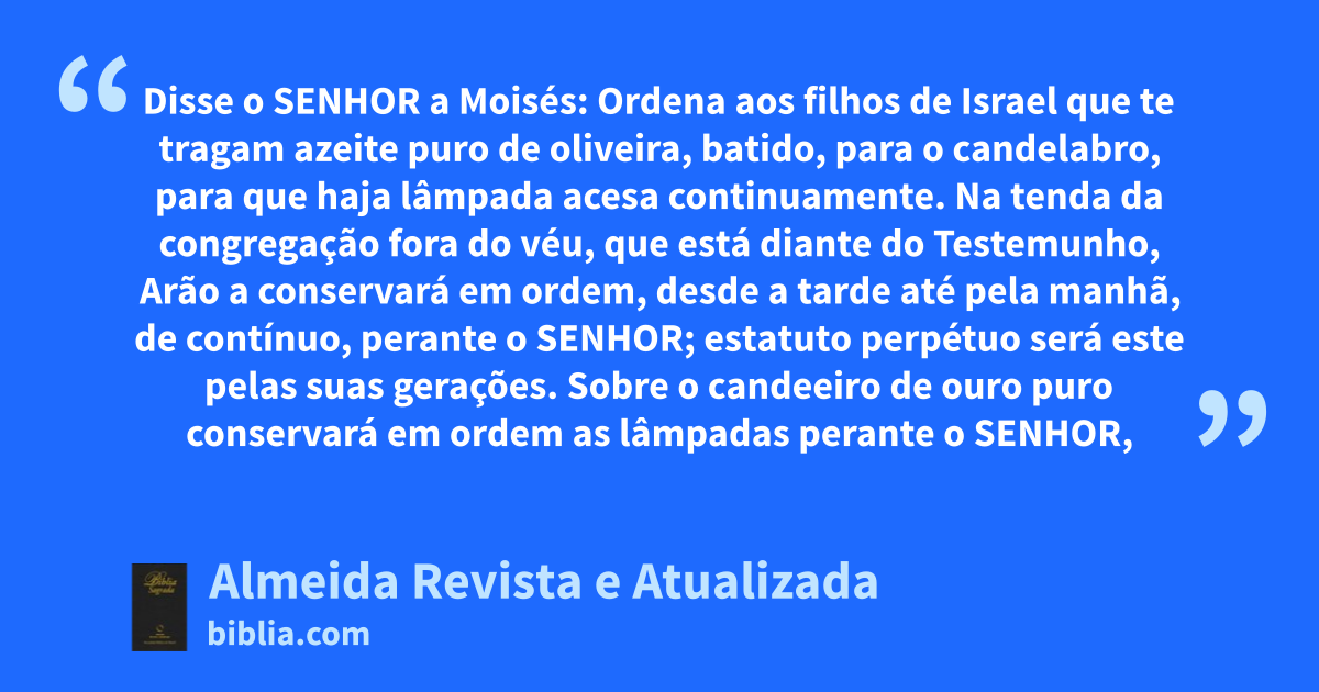 24 1 Disse o Senhor a Moisés: 2 Ordena aos filhos de Israel que te tragam azeite puro de oliveira, batido, para o candelabro, para que haja lâmpada acesa continuamente. 3 Na tenda da congregação fora do véu, que está diante do Testemunho, Arão a conservará em ordem, desde a tarde até pela manhã, de contínuo, perante o Senhor; estatuto perpétuo será este pelas suas gerações. 4 Sobre o candeeiro de ouro puro conservará em ordem as lâmpadas perante o Senhor, continuamente.