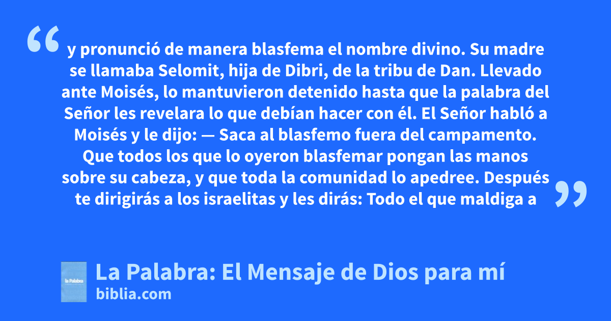 14 — Saca al blasfemo fuera del campamento. Que todos los que lo oyeron blasfemar pongan las manos sobre su cabeza, y que toda la comunidad lo apedree. 15 Después te dirigirás a los israelitas y les dirás: Todo el que maldiga a su Dios, cargará con las consecuencias de su pecado. 16 Y el que blasfeme contra el nombre del Señor será castigado con la muerte: toda la comunidad lo apedreará; sea extranjero o sea nativo, si blasfema contra el nombre divino, morirá.