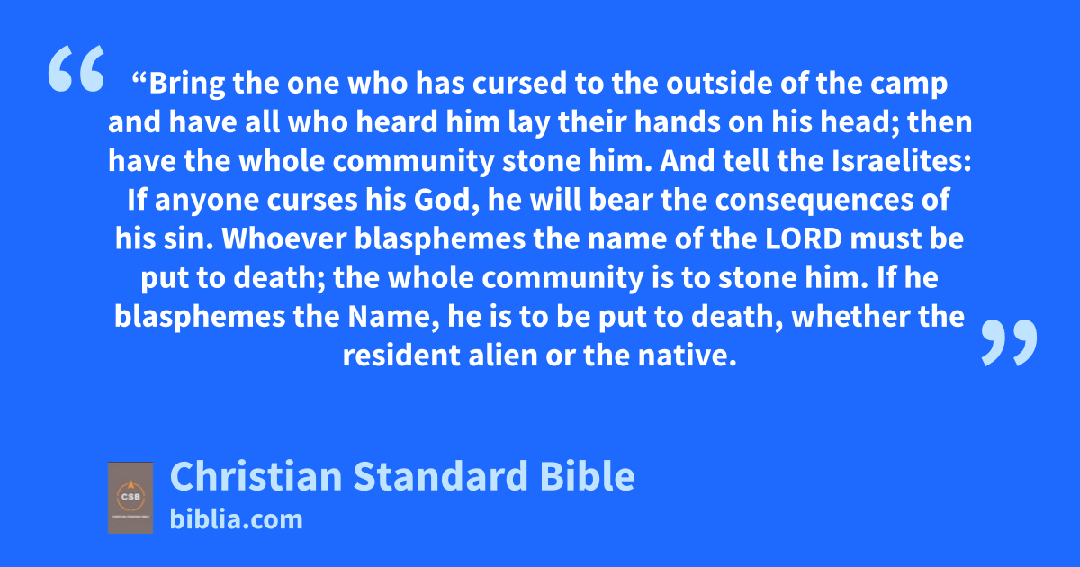 13 Then the Lord spoke to Moses: 14 “Bring the one who has cursed to the outside of the camp and have all who heard him lay their hands on his head; then have the whole community stone him.u 15 And tell the Israelites: If anyone curses his God, he will bear the consequences of his sin. 16 Whoever blasphemes the name of the Lord must be put to death;v the whole community is to stone him. If he blasphemes the Name, he is to be put to death, whether the resident alien or the native.