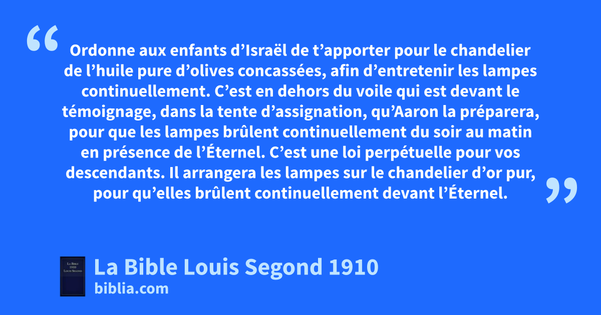 1L’Éternel parla à Moïse, et dit: 2Ordonne aux enfants d’Israël de t’apporter pour le chandelier de l’huile pure d’olives concassées, afin d’entretenir les lampes continuellement. 3C’est en dehors du voile qui est devant le témoignage, dans la tente d’assignation, qu’Aaron la préparera, pour que les lampes brûlent continuellement du soir au matin en présence de l’Éternel. C’est une loi perpétuelle pour vos descendants. 4Il arrangera les lampes sur le chandelier d’or pur, pour qu’elles brûlent continuellement devant l’Éternel.