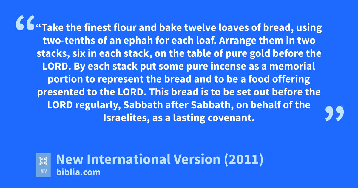 5 “Take the finest flour and bake twelve loaves of bread,s using two-tenths of an ephaha t for each loaf. 6 Arrange them in two stacks, six in each stack, on the table of pure goldu before the Lord. 7 By each stack put some pure incensev as a memorialb portionw to represent the bread and to be a food offering presented to the Lord. 8 This bread is to be set out before the Lord regularly,x Sabbath after Sabbath,y on behalf of the Israelites, as a lasting covenant. 9 It belongs to Aaron and his sons,z who are to eat it in the sanctuary area,a because it is a most holyb part of their perpetual share of the food offerings presented to the Lord.”