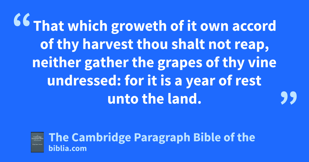 XXV. And the Lord spake unto Moses in mount Sinai, saying, 2 Speak unto the children of Israel, and say unto them, When ye come into the land which I give you, then shall the land * keep aa sabbath unto the Lord. 3 Six years thou shalt sow thy field, and six years thou shalt prune thy vineyard, and gather in the fruit thereof; 4 but in the seventh year shall be a sabbath of rest unto the land, a sabbath for the Lord: thou shalt neither sow thy field, nor prune thy vineyard. 5 bThat which groweth of it own accord of thy harvest thou shalt not reap, neither gather the grapes * of thy vine undressed: for it is a year of rest unto the land. 6 And the sabbath of the land shall be meat for you; for thee, and for thy servant, and for thy maid, and for thy hired servant, and for thy stranger that sojourneth with thee, 7 and for thy cattle, and for the beast that are in thy land, shall all the increase thereof be meat.