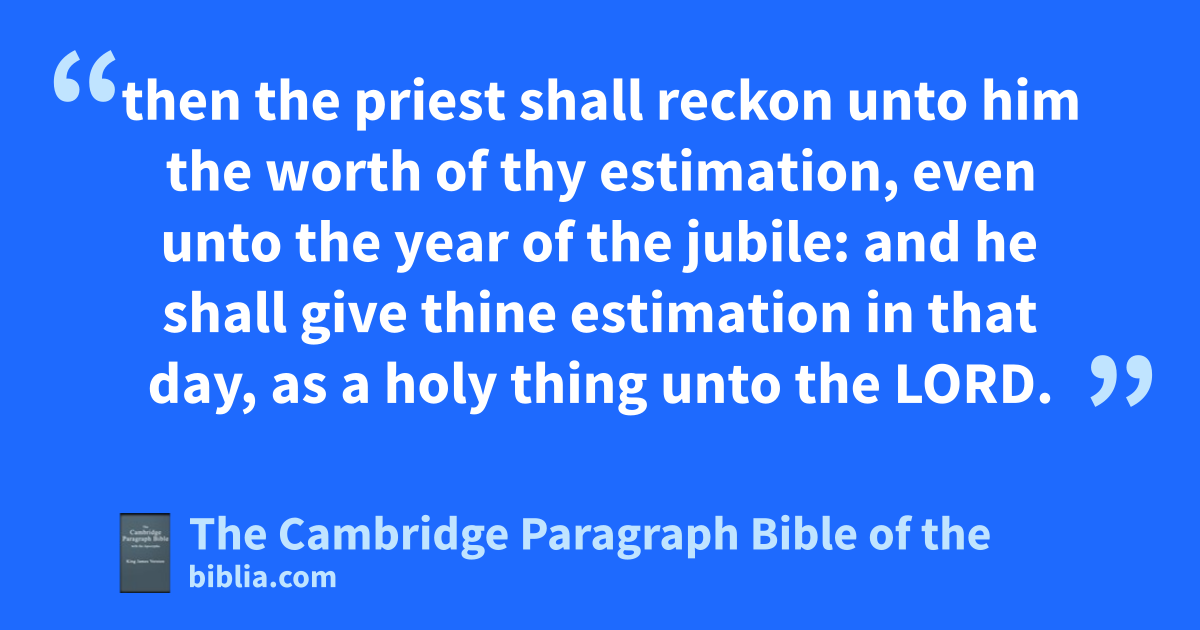 14 And when a man shall sanctify his house to be holy unto the Lord, then the priest shall estimate it, whether it be good or bad: as the priest shall estimate it, so shall it stand. 15 gAnd if he that sanctified it will redeem his house, then he shall add the fifth part of the money of thy estimation unto it, and it shall be his. 16 And if a man shall sanctify unto the Lord some part of a field of his possession, then thy estimation shall be according to the seed thereof: * a homer of barley seed shall be valued at fifty shekels of silver. 17 If he sanctify his field from the year of jubile, according to thy estimation it shall stand. 18 But if he sanctify his field after the jubile, then the priest shall hreckon unto him the money according to the years that remain, even unto the year of the jubile, and it shall be abated from thy estimation. 19 iAnd if he that sanctified the field will in any wise redeem it, then he shall add the fifth part of the money of thy estimation unto it, and it shall be assured to him. 20 And if he will not redeem the field, or if he have sold the field to another man, it shall not be redeemed any more. 21 But the field, kwhen it goeth out in the jubile, shall be holy unto the Lord, as a field ldevoted; mthe possession thereof shall be the priest’s. 22 And if a man sanctify unto the Lord a field which he hath bought, which is not of the fields of nhis possession; 23 othen the priest shall reckon unto him pthe worth of thy estimation, even unto the year of the jubile: and he shall give thine estimation in that day, as a holy thing unto the Lord. 24 qIn the year of the jubile the field shall return unto him of whom it was bought, even to him to whom the possession of the land did belong. 25 And all thy estimations shall be according to rthe shekel of the sanctuary: stwenty gerahs shall be the shekel.