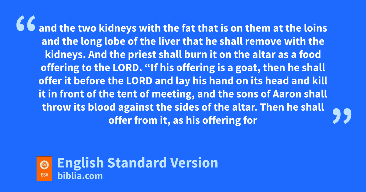 12 “If his offering is a goat, then he shall offer it before the Lord 13 and lay his hand on its head and kill it in front of the tent of meeting, and the sons of Aaron shall throw its blood against the sides of the altar. 14 Then he shall offer from it, as his offering for a food offering to the Lord, the fat covering the entrails and all the fat that is on the entrails 15 and the two kidneys with the fat that is on them at the loins and the long lobe of the liver that he shall remove qwith the kidneys. 16 And the priest shall burn them on the altar as a rfood offering with a pleasing aroma. sAll fat is the Lord’s. 17 It shall be a statute forever throughout your generations, in all your dwelling places, that you eat neither sfat nor tblood.”