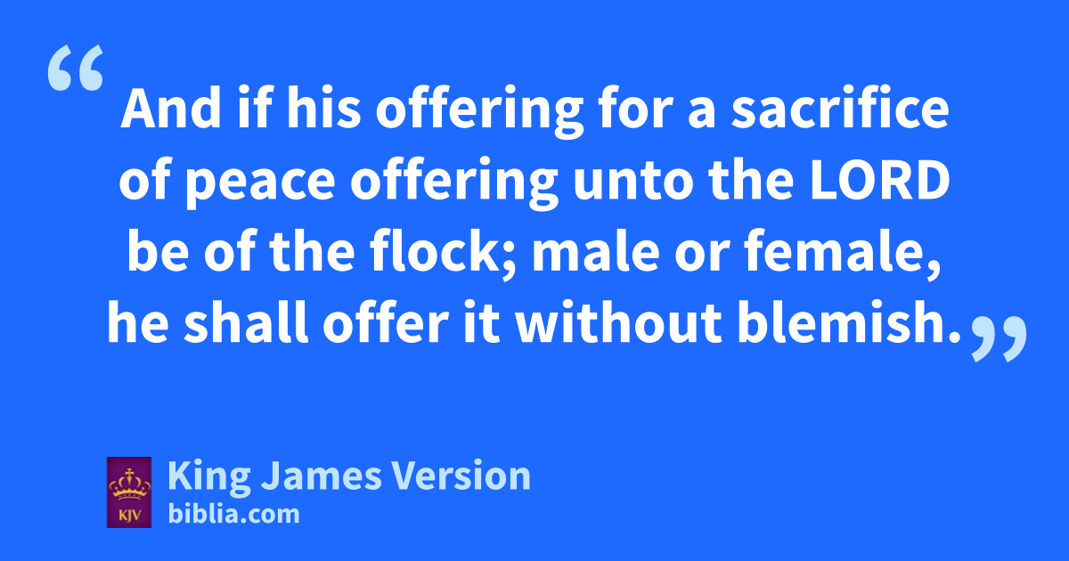 3 And if his oblation be a asacrifice of peace offering, if he offer it of the herd; whether it be a male or female, he shall offer it bwithout blemish before the Lord. 2 And che shall lay his hand upon the head of his offering, and kill it at the door of the tabernacle of the congregation: and Aaron’s sons the priests shall sprinkle the blood upon the altar round about. 3 And he shall offer of the sacrifice of the peace offering an offering made by fire unto the Lord; dthe ||fat that covereth the inwards, and all the ||fat that is upon the inwards, 4 And the two kidneys, and the fat that is on them, which is by the flanks, and the ||caul above the liver, with the kidneys, it shall he take away. 5 And Aaron’s sons eshall burn it on the altar upon the burnt sacrifice, which is upon the wood that is on the fire: it is an offering made by fire, of a sweet savour unto the Lord. 6 And if his offering for a sacrifice of peace offering unto the Lord be of the flock; male or female, fhe shall offer it without blemish. 7 If he offer a lamb for his offering, then shall he offer it before the Lord. 8 And he shall lay his hand upon the head of his offering, and kill it before the tabernacle of the congregation: and Aaron’s sons shall sprinkle the blood thereof round about upon the altar. 9 And he shall offer of the sacrifice of the peace offering an offering made by fire unto the Lord; the fat thereof, and gthe whole rump, it shall he take off hard by the backbone; and the fat that covereth the inwards, and all the fat that is upon the inwards, 10 And the two kidneys, and the fat that is upon them, which is by the flanks, and the caul above the liver, with the kidneys, it shall he take away. 11 And the priest shall burn it upon the altar: it is hthe food of the offering made by fire unto the Lord. 12 And if his offering be a goat, then ihe shall offer it before the Lord. 13 And he shall lay his hand upon the head of it, and kill it before the tabernacle of the congregation: and the sons of Aaron shall sprinkle the blood thereof upon the altar round about. 14 And he shall offer thereof his offering, even an offering made by fire unto the Lord; the fat that covereth the inwards, and all the fat that is upon the inwards, 15 And the two kidneys, and the fat that is upon them, which is by the flanks, and the caul above the liver, with the kidneys, it shall he take away. 16 And the priest shall burn them upon the altar: it is the food of the offering made by fire for a sweet savour: kall the fat is the Lord’s. 17 It shall be a lperpetual statute for your generations throughout all your dwellings, that ye eat neither kfat nor mblood.
