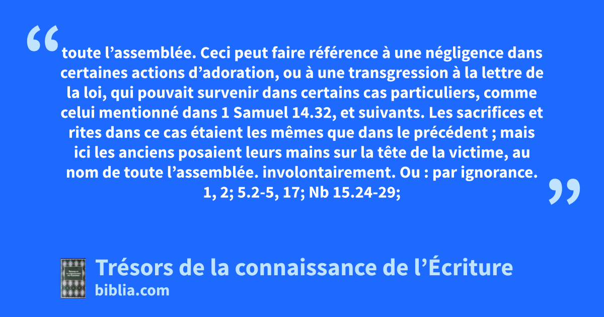 toute l’assemblée. Ceci peut faire référence à une négligence dans certaines actions d’adoration, ou à une transgression à la lettre de la loi, qui pouvait survenir dans certains cas particuliers, comme celui mentionné dans 1 Samuel 14.32, et suivants. Les sacrifices et rites dans ce cas étaient les mêmes que dans le précédent ; mais ici les anciens posaient leurs mains sur la tête de la victime, au nom de toute l’assemblée. involontairement. Ou : par ignorance. 1, 2; 5.2-5, 17; Nb 15.24-29; Jos 7.11, 24-26; 1Tm 1.13; Hé 10.26-29 se rendant ainsi coupable. 5.2-5, 17; 5.23; Esd 10.19; Os 5.15 1Co 11.27