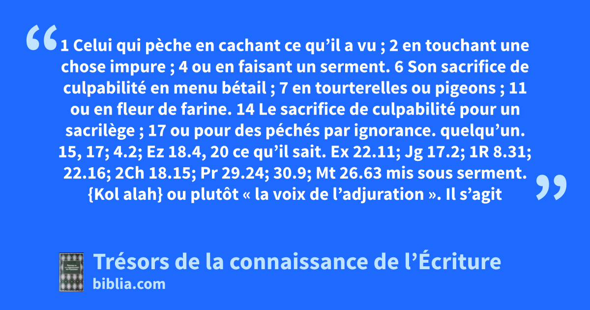 1 Celui qui pèche en cachant ce qu’il a vu ; 2 en touchant une chose impure ; 4 ou en faisant un serment. 6 Son sacrifice de culpabilité en menu bétail ; 7 en tourterelles ou pigeons ; 11 ou en fleur de farine. 14 Le sacrifice de culpabilité pour un sacrilège ; 17 ou pour des péchés par ignorance.