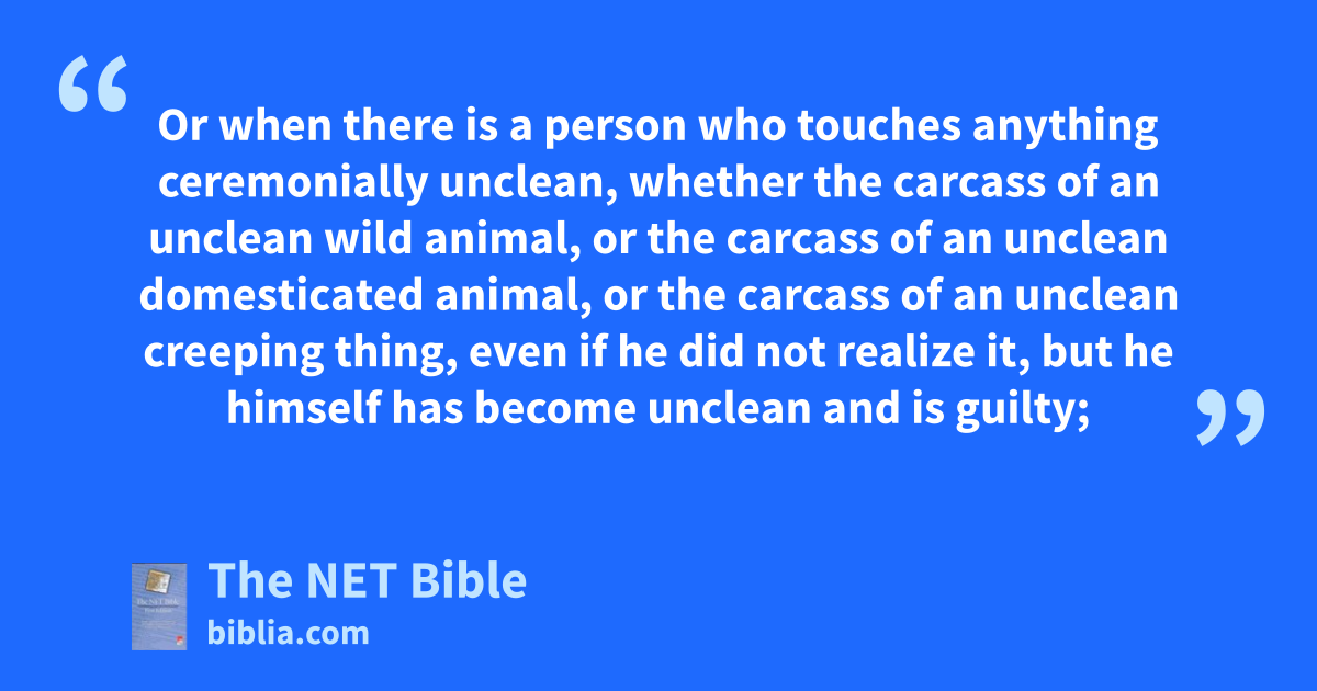 5:1 “ ‘When a person sins1 in that he hears a public curse against one who fails to testify2 and he is a witness (he either saw or knew what had happened3) and he does not make it known,4 then he will bear his punishment for iniquity.5 5:2 Or when there is6 a person who touches anything ceremonially7 unclean, whether the carcass of an unclean wild animal, or the carcass of an unclean domesticated animal, or the carcass of an unclean creeping thing, even if he did not realize it,8 but he himself has become unclean and is guilty;9 5:3 or when he touches human uncleanness with regard to anything by which he can become unclean,10 even if he did not realize it, but he himself has later come to know it and is guilty; 5:4 or when a person swears an oath, speaking thoughtlessly11 with his lips, whether to do evil or to do good, with regard to anything which the individual might speak thoughtlessly in an oath, even if he did not realize it, but he himself has later come to know it and is guilty with regard to one of these oaths12—5:5 when an individual becomes guilty with regard to one of these things13 he must confess how he has sinned,14 5:6 and he must bring his penalty for guilt15 to the Lord for his sin that he has committed, a female from the flock, whether a female sheep or a female goat, for a sin offering. So the priest will make atonement16 on his behalf for17 his sin.