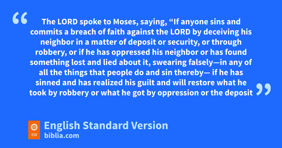 6 1 The Lord spoke to Moses, saying, 2 “If anyone sins and bcommits a breach of faith against the Lord by cdeceiving his neighbor in da matter of deposit or security, or through robbery, or eif he has oppressed his neighbor 3 or fhas found something lost and lied about it, gswearing falsely—in any of all the things that people do and sin thereby— 4 if he has sinned and has realized his guilt and will restore ewhat he took by robbery or what he got by oppression or the deposit that was committed to him or the lost thing that he found 5 or anything about which he has sworn falsely, he shall hrestore it in full and shall add a fifth to it, and give it to him to whom it belongs on the day he realizes his guilt. 6 And he shall bring to the priest as his compensation to the Lord ia ram without blemish out of the flock, or its equivalent, for a guilt offering. 7 jAnd the priest shall make atonement for him before the Lord, and he shall be forgiven for any of the things that one may do and thereby become guilty.”