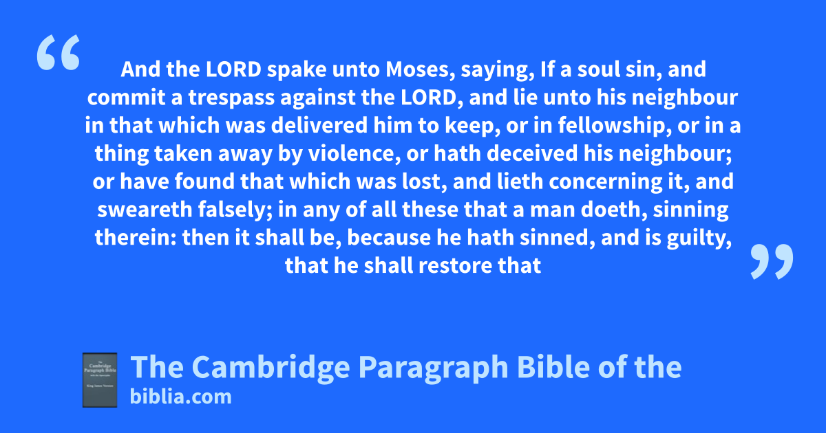 VI. And the Lord spake unto Moses, saying, 2 If a soul sin, and acommit a trespass against the Lord, and blie unto his neighbour in that cwhich was delivered him to keep, or * in * fellowship, or in a thing taken away by violence, or hath ddeceived his neighbour; 3 or ehave found that which was lost, and lieth concerning it, and fsweareth falsely; in any of all these that a man doeth, sinning therein: 4 then it shall be, because he hath sinned, and is guilty, that he shall restore that which he took violently away, or the thing which he hath deceitfully gotten, or that which was delivered him to keep, or the lost thing which he found, 5 or all that about which he hath sworn falsely; he shall even grestore it in the principal, and shall add the fifth part more thereto, and give it unto him to whom it appertaineth, * * in the day of his trespass offering. 6 And he shall bring his trespass offering unto the Lord, ha ram without blemish out of the flock, with thy estimation, for a trespass offering, unto the priest: 7 iand the priest shall make an atonement for him before the Lord: and it shall be forgiven him for any thing of all that he hath done in trespassing therein.