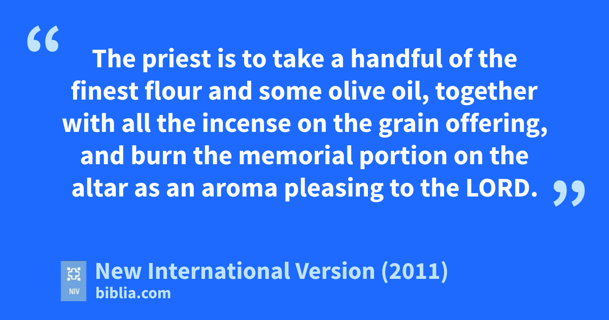 14 “ ‘These are the regulations for the grain offering:o Aaron’s sons are to bring it before the Lord, in front of the altar. 15 The priest is to take a handful of the finest flour and some olive oil, together with all the incensep on the grain offering,q and burn the memorialb portionr on the altar as an aroma pleasing to the Lord. 16 Aaron and his sonss shall eat the restt of it, but it is to be eaten without yeastu in the sanctuary area;v they are to eat it in the courtyardw of the tent of meeting.x 17 It must not be baked with yeast; I have given it as their sharey of the food offerings presented to me.z Like the sin offeringc and the guilt offering, it is most holy.a 18 Any male descendant of Aaron may eat it.b For all generations to comec it is his perpetual shared of the food offerings presented to the Lord. Whatever touches them will become holy.d e’ ”