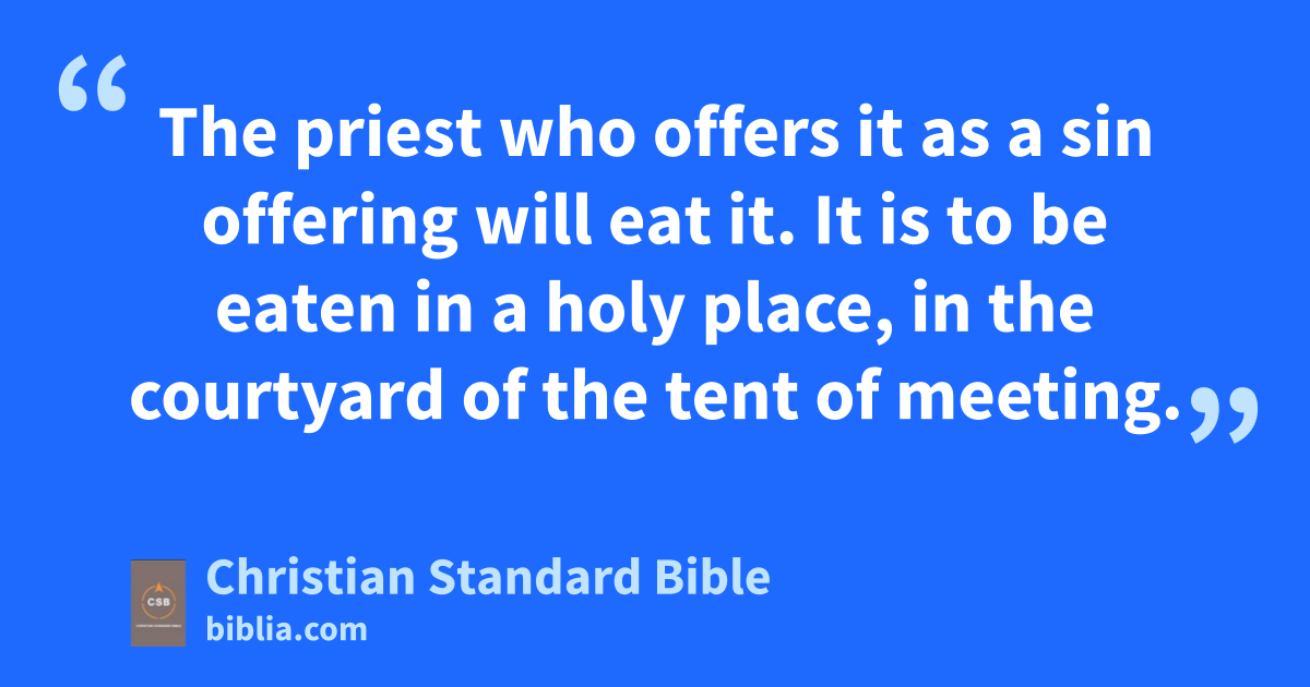 24 The Lord spoke to Moses: 25 “Tell Aaron and his sons: This is the law of the sin offering.n The sin offering is most holy and must be slaughtered before the Lord at the place where the burnt offering is slaughtered. 26 The priest who offers it as a sin offering will eat it. It is to be eaten in a holy place,o in the courtyard of the tent of meeting. 27 Anything that touches its flesh will become holy, and if any of its blood spatters on a garment, then you must wash that garmentD in a holy place. 28 A clay pot in which the sin offering is boiled is to be broken; if it is boiled in a bronze vessel, it is to be scoured and rinsed with water. 29 Any male among the priests may eat it; it is especially holy. 30 But no sin offering may be eaten if its blood has been brought into the tent of meeting to make atonement in the holy place; it must be burned.