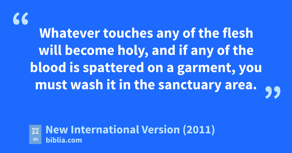 24 The Lord said to Moses, 25 “Say to Aaron and his sons: ‘These are the regulations for the sin offering:m The sin offering is to be slaughtered before the Lordn in the placeo the burnt offering is slaughtered; it is most holy. 26 The priest who offers it shall eat it; it is to be eaten in the sanctuary area,p in the courtyardq of the tent of meeting.r 27 Whatever touches any of the flesh will become holy,s and if any of the blood is spattered on a garment, you must wash it in the sanctuary area. 28 The clay pott the meat is cooked in must be broken; but if it is cooked in a bronze pot, the pot is to be scoured and rinsed with water. 29 Any male in a priest’s family may eat it;u it is most holy.v 30 But any sin offering whose blood is brought into the tent of meeting to make atonementw in the Holy Placex must not be eaten; it must be burned up.y