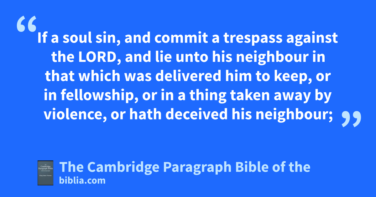 VI. And the Lord spake unto Moses, saying, 2 If a soul sin, and acommit a trespass against the Lord, and blie unto his neighbour in that cwhich was delivered him to keep, or * in * fellowship, or in a thing taken away by violence, or hath ddeceived his neighbour; 3 or ehave found that which was lost, and lieth concerning it, and fsweareth falsely; in any of all these that a man doeth, sinning therein: 4 then it shall be, because he hath sinned, and is guilty, that he shall restore that which he took violently away, or the thing which he hath deceitfully gotten, or that which was delivered him to keep, or the lost thing which he found, 5 or all that about which he hath sworn falsely; he shall even grestore it in the principal, and shall add the fifth part more thereto, and give it unto him to whom it appertaineth, * * in the day of his trespass offering. 6 And he shall bring his trespass offering unto the Lord, ha ram without blemish out of the flock, with thy estimation, for a trespass offering, unto the priest: 7 iand the priest shall make an atonement for him before the Lord: and it shall be forgiven him for any thing of all that he hath done in trespassing therein.