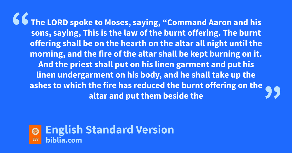 8 2 The Lord spoke to Moses, saying, 9 “Command Aaron and his sons, saying, This is the law of the burnt offering. The burnt offering shall be on the hearth on the altar all night until the morning, and the fire of the altar shall be kept burning on it. 10 And kthe priest shall put on his linen garment and put his linen undergarment on his body, and he shall take up the ashes to which the fire has reduced the burnt offering on the altar and put them lbeside the altar. 11 Then mhe shall take off his garments and put on other garments and carry the ashes noutside the camp to a clean place. 12 The fire on the altar shall be kept burning on it; it shall not go out. The priest shall burn wood on it every morning, and he shall arrange the burnt offering on it and shall burn on it othe fat of the peace offerings. 13 Fire shall be kept burning on the altar continually; it shall not go out.