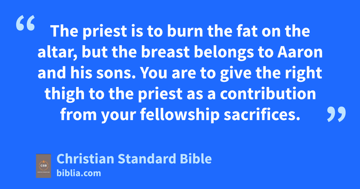 28 The Lord spoke to Moses: 29 “Tell the Israelites: The one who presents a fellowship sacrifice to the Lord is to bring an offering to the Lord from his sacrifice. 30 His own hands will bring the food offerings to the Lord. He will bring the fat together with the breast. The breast is to be presented as a presentation offeringn before the Lord. 31 The priest is to burn the fat on the altar, but the breast belongs to Aaron and his sons. 32 You are to give the right thigho to the priest as a contribution from your fellowship sacrifices. 33 The son of Aaron who presents the blood of the fellowship offering and the fat will have the right thigh as a portion. 34 I have taken from the Israelites the breast of the presentation offering and the thigh of the contribution from their fellowship sacrifices, and have assigned them to the priest Aaron and to his sons as a permanent portion* p from the Israelites.”