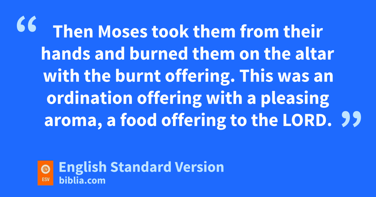 22 Then mhe presented the other ram, the ram of ordination, and Aaron and his sons laid their hands on the head of the ram. 23 And he killed it, and Moses took some of its blood and nput it on the lobe of Aaron’s right ear and on the thumb of his right hand and on the big toe of his right foot. 24 Then he presented Aaron’s sons, and Moses put some of the blood on the lobes of their right ears and on the thumbs of their right hands and on the big toes of their right feet. And Moses threw the blood against the sides of the altar. 25 Then he took the fat and the fat tail and all the fat that was on the entrails and the long lobe of the liver and the two kidneys with their fat and the right thigh, 26 and out of the basket of unleavened bread that was before the Lord he took one unleavened loaf and one loaf of bread with oil and one wafer and placed them on the pieces of fat and on the right thigh. 27 And he put all these in the hands of Aaron and in the hands of his sons and waved them as a wave offering before the Lord. 28 Then Moses took them from their hands and burned them on the altar with the burnt offering. This was an ordination offering with a pleasing aroma, a food offering to the Lord. 29 And Moses took the breast and waved it for a wave offering before the Lord. It was Moses’ portion of the ram of ordination, as the Lord commanded Moses.