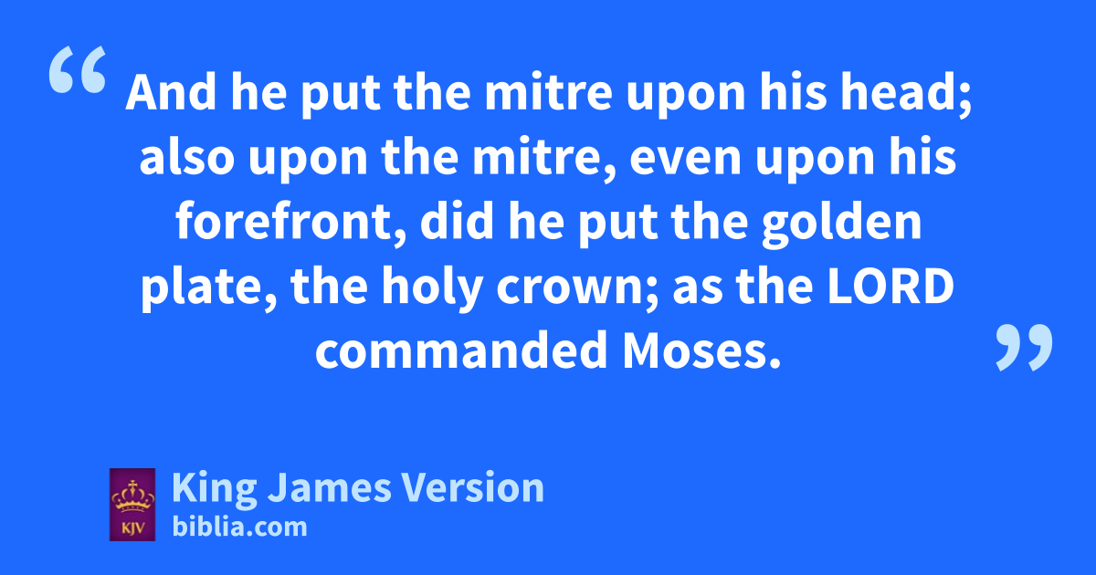 8 And the Lord spake unto Moses, saying, 2 aTake Aaron and his sons with him, and bthe garments, and cthe anointing oil, and da bullock for the sin offering, and two rams, and a basket of unleavened bread; 3 And gather thou all the congregation together unto the door of the tabernacle of the congregation. 4 And Moses did as the Lord commanded him; and the assembly was gathered together unto the door of the tabernacle of the congregation. 5 And Moses said unto the congregation, eThis is the thing which the Lord commanded to be done. 6 And Moses brought Aaron and his sons, eand washed them with water. 7 fAnd he put upon him the gcoat, and girded him with the girdle, and clothed him with the robe, and put the ephod upon him, and he girded him with the curious girdle of the ephod, fand bound it unto him therewith. 8 And he put the breastplate upon him: also he hput in the breastplate the Urim and the Thummim. 9 iAnd he put the mitre upon his head; also kupon the mitre, even upon his forefront, did he put the golden plate, the holy crown; as the Lord commanded Moses. 10 lAnd Moses took the anointing oil, and anointed the tabernacle and all that was therein, and sanctified them. 11 And he sprinkled thereof upon the altar seven times, and anointed the altar and all his vessels, both the laver and his foot, to sanctify them. 12 And he mpoured of the anointing oil upon Aaron’s head, and anointed him, to sanctify him. 13 nAnd Moses brought Aaron’s sons, and put coats upon them, and girded them with girdles, and †put bonnets upon them; as the Lord commanded Moses. 14 oAnd he brought the bullock for the sin offering: and Aaron and his sons plaid their hands upon the head of the bullock for the sin offering. 15 And he slew it; qand Moses took the blood, and put it upon the horns of the altar round about with his finger, and purified the altar, and poured the blood at the bottom of the altar, and sanctified it, to make reconciliation upon it. 16 rAnd he took all the fat that was upon the inwards, and the caul above the liver, and the two kidneys, and their fat, and Moses burned it upon the altar. 17 But the bullock, and his hide, his flesh, and his dung, he burnt with fire without the camp; as the Lord scommanded Moses. 18 tAnd he brought the ram for the burnt offering: and Aaron and his sons laid their hands upon the head of the ram. 19 And he killed it; and Moses sprinkled the blood upon the altar round about. 20 And he cut the ram into pieces; and Moses burnt the head, and the pieces, and uthe fat. 21 And he washed the inwards and the legs in water; and Moses burnt the whole ram upon the altar: it was a burnt sacrifice for a sweet savour, and an offering made by fire unto the Lord; as the Lord commanded Moses. 22 And whe brought the other ram, the ram of consecration: and Aaron and his sons laid their hands upon the head of the ram. 23 And he slew it; and Moses took of the blood of it, and put it upon the tip of Aaron’s right ear, and upon the thumb of his right hand, and upon the great toe of his right foot. 24 And he brought Aaron’s sons, and Moses put of the blood upon the tip of their right ear, and upon the thumbs of their right hands, and upon the great toes of their right feet: and Moses sprinkled the blood upon the altar round about. 25 xAnd he took the fat, and the rump, and all the fat that was upon the inwards, and the caul above the liver, and the two kidneys, and their fat, and the right shoulder: 26 yAnd out of the basket of unleavened bread, that was before the Lord, he took one unleavened cake, and a cake of oiled bread, and one wafer, and put them on the fat, and upon the right shoulder: 27 And he put all zupon Aaron’s hands, and upon his sons’ hands, and waved them for a wave offering before the Lord. 28 aAnd Moses took them from off their hands, and burnt them on the altar upon the burnt offering: they were consecrations for a sweet savour: it is an offering made by fire unto the Lord. 29 And Moses took the breast, and waved it for a wave offering before the Lord: for of the ram of consecration it was Moses’ bpart; as the Lord commanded Moses. 30 And cMoses took of the anointing oil, and of the blood which was upon the altar, and sprinkled it upon Aaron, and upon his garments, and upon his sons, and upon his sons’ garments with him; and sanctified Aaron, and his garments, and his sons, and his sons’ garments with him.