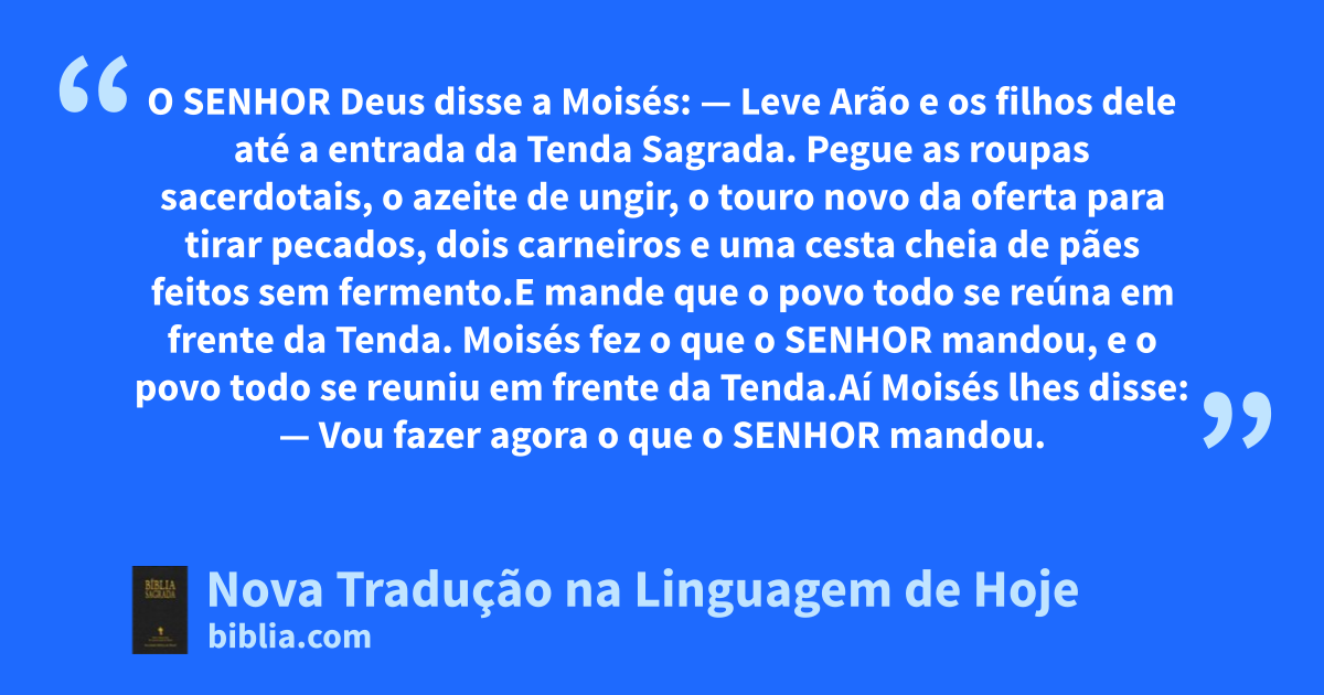 4 Moisés fez o que o Senhor mandou, e o povo todo se reuniu em frente da Tenda.5 Aí Moisés lhes disse: