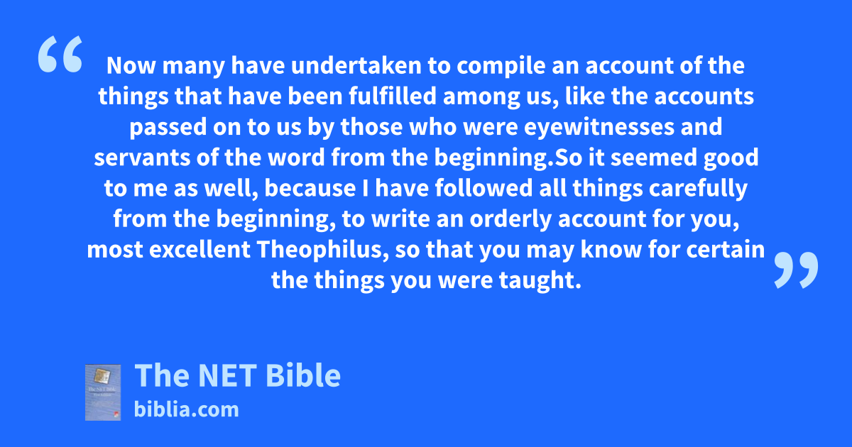 1:1 Now1 many have undertaken to compile an account2 of the things3 that have been fulfilled4 among us, 1:2 like the accounts5 passed on6 to us by those who were eyewitnesses and servants of the word7 from the beginning.8 1:3 So9 it seemed good to me as well,10 because I have followed11 all things carefully from the beginning, to write an orderly account12 for you, most excellent Theophilus, 1:4 so that you may know for certain13 the things you were taught.14