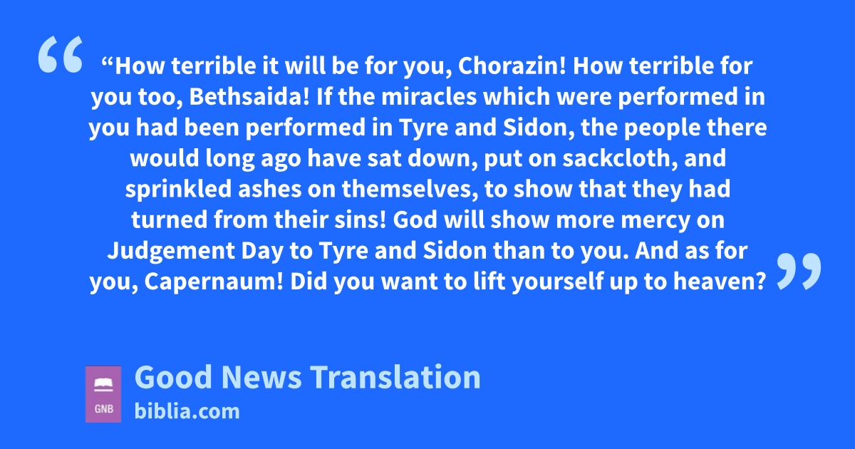 13 *“How terrible it will be for you, Chorazin! How terrible for you too, Bethsaida! If the miracles which were performed in you had been performed in Tyre and Sidon, the people there would long ago have sat down, put on sackcloth, and sprinkled ashes on themselves, to show that they had turned from their sins! 14God will show more mercy on Judgement Day to Tyre and Sidon than to you. 15*And as for you, Capernaum! Did you want to lift yourself up to heaven? You will be thrown down to hell!”