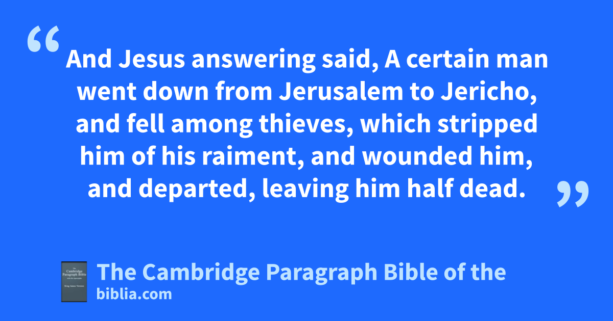 25 And behold, a certain jlawyer stood up, and ktempted him, saying, lMaster, what shall I do to inherit eternal life? 26 He said unto him, What is written in the law? how readest thou? 27 And he answering said, mThou shalt love the Lord thy God with all thy heart, and with all thy soul, and with all thy strength, and with all thy mind; and nthy neighbour as thyself. 28 And he said unto him, Thou hast answered right: this do, and othou shalt live. 29 But he, willing to pjustify himself, said unto Jesus, And who is my neighbour? 30 And Jesus answering said, A certain man qwent down from Jerusalem to rJericho, and fell among sthieves, which stripped him of his raiment, and wounded him, and departed, leaving him half dead. 31 And by chance there qcame down a certain priest that way: and when he saw him, he tpassed by on the other side. 32 And likewise a Levite, when he was at the place, came and looked on him, and tpassed by on the other side. 33 But a certain uSamaritan, as he journeyed, came where he was: and when he saw him, he had compassion on him, 34 and went to him, and xbound up his wounds, pouring in xoil and wine, and set him on his own beast, and brought him to an inn, and took care of him. 35 And on the morrow when he departed, he took out two * pence, and gave them to the host, and said unto him, Take care of him; and whatsoever thou spendest more, when I come again, I will repay thee. 36 Which now of these three, thinkest thou, was neighbour unto him that fell among the sthieves? 37 And he said, He that yshewed mercy on him. Then said Jesus unto him, Go, and do thou likewise.
