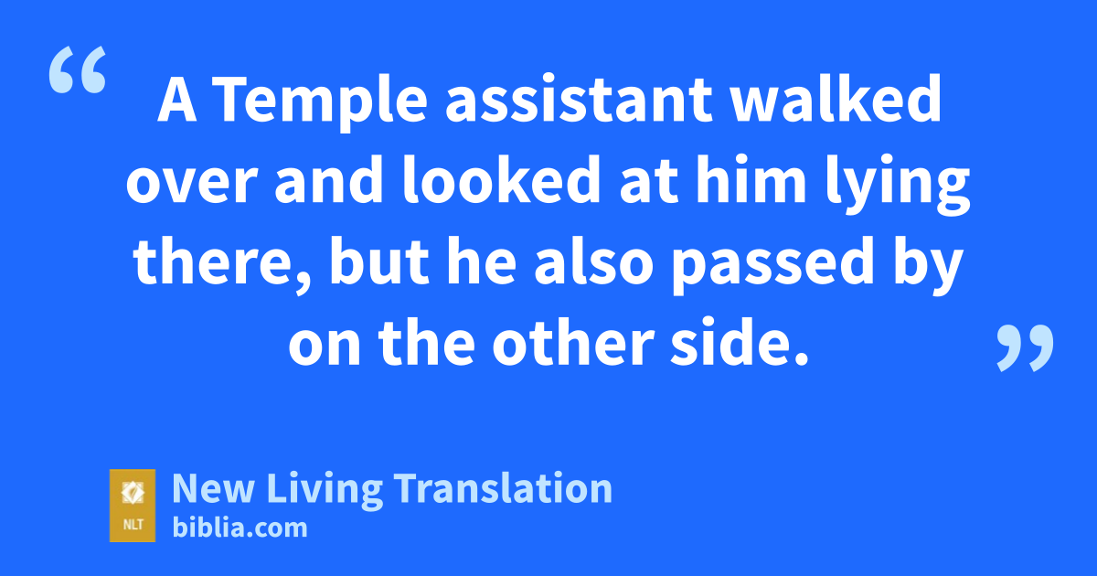 31 “By chance a priest came along. But when he saw the man lying there, he crossed to the other side of the road and passed him by. 32 A Temple assistant* walked over and looked at him lying there, but he also passed by on the other side.