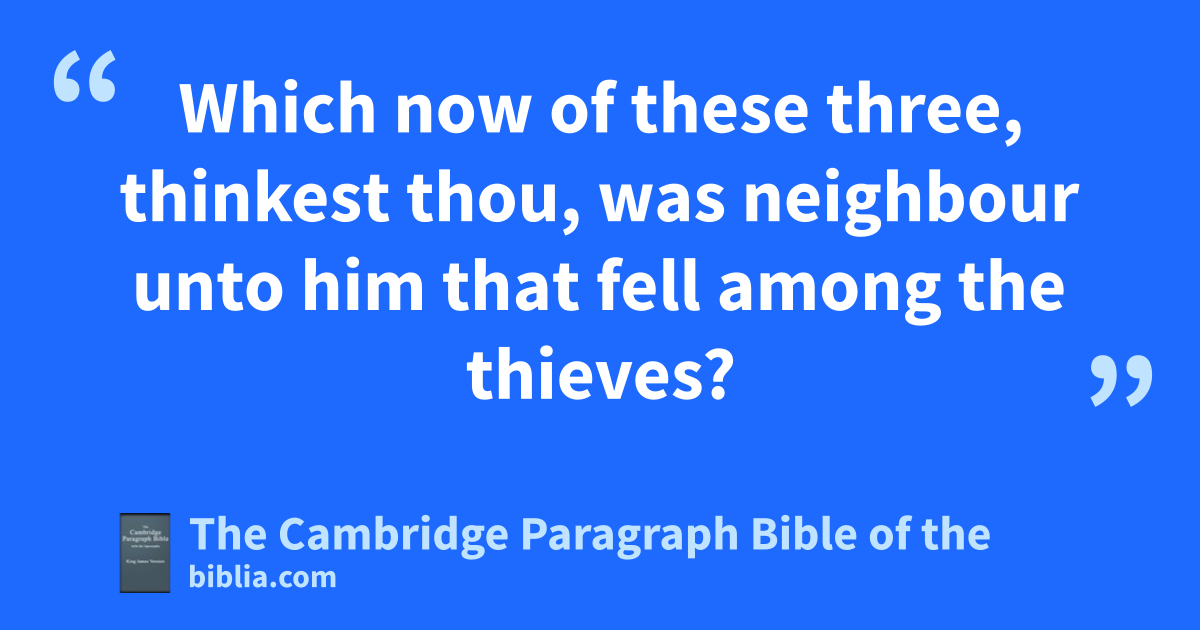 25 And behold, a certain jlawyer stood up, and ktempted him, saying, lMaster, what shall I do to inherit eternal life? 26 He said unto him, What is written in the law? how readest thou? 27 And he answering said, mThou shalt love the Lord thy God with all thy heart, and with all thy soul, and with all thy strength, and with all thy mind; and nthy neighbour as thyself. 28 And he said unto him, Thou hast answered right: this do, and othou shalt live. 29 But he, willing to pjustify himself, said unto Jesus, And who is my neighbour? 30 And Jesus answering said, A certain man qwent down from Jerusalem to rJericho, and fell among sthieves, which stripped him of his raiment, and wounded him, and departed, leaving him half dead. 31 And by chance there qcame down a certain priest that way: and when he saw him, he tpassed by on the other side. 32 And likewise a Levite, when he was at the place, came and looked on him, and tpassed by on the other side. 33 But a certain uSamaritan, as he journeyed, came where he was: and when he saw him, he had compassion on him, 34 and went to him, and xbound up his wounds, pouring in xoil and wine, and set him on his own beast, and brought him to an inn, and took care of him. 35 And on the morrow when he departed, he took out two * pence, and gave them to the host, and said unto him, Take care of him; and whatsoever thou spendest more, when I come again, I will repay thee. 36 Which now of these three, thinkest thou, was neighbour unto him that fell among the sthieves? 37 And he said, He that yshewed mercy on him. Then said Jesus unto him, Go, and do thou likewise.