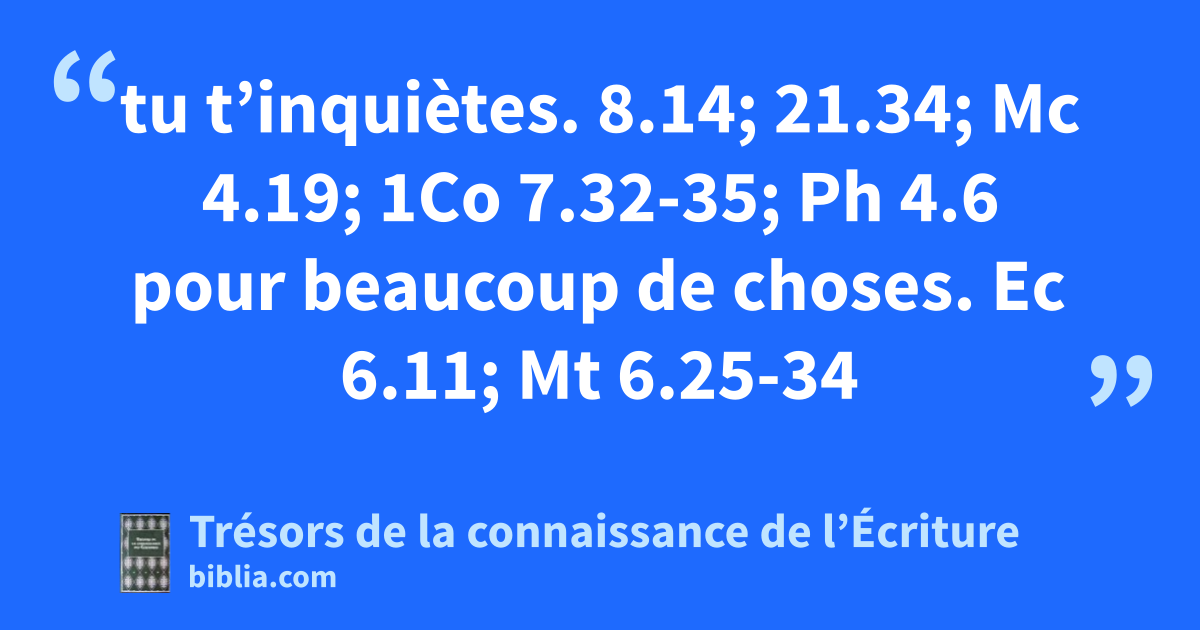 tu t’inquiètes. 8.14; 21.34; Mc 4.19; 1Co 7.32-35; Ph 4.6 pour beaucoup de choses. Ec 6.11; Mt 6.25-34