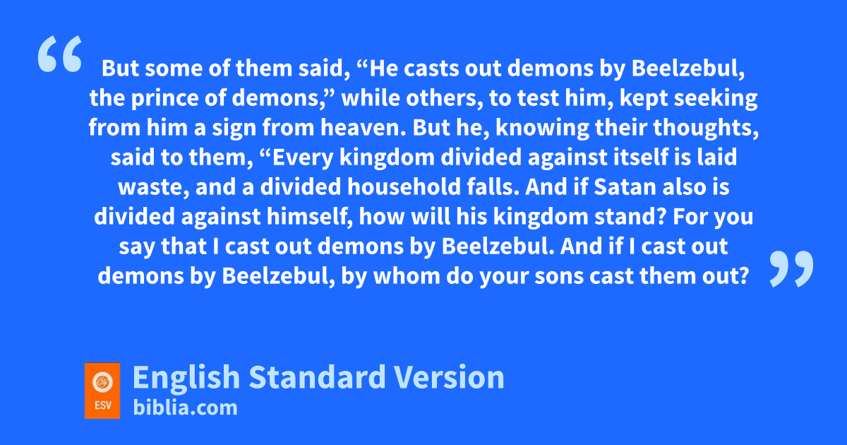14 yNow he was casting out a demon that was mute. When the demon had gone out, the mute man spoke, and the people marveled. 15 But some of them said, “He casts out demons zby Beelzebul, the prince of demons,” 16 while others, ato test him, kept seeking from him a sign from heaven. 17 bBut he, cknowing their thoughts, said to them, “Every kingdom divided against itself is laid waste, and a divided household falls. 18 And if Satan also is divided against himself, how will his kingdom stand? For you say that I cast out demons by Beelzebul. 19 And if I cast out demons by Beelzebul, dby whom do eyour sons cast them out? Therefore they will be your judges. 20 But if it is by fthe finger of God that I cast out demons, then gthe kingdom of God has come upon you. 21 When a strong man, fully armed, guards his own palace, his goods are safe; 22 hbut when one stronger than he attacks him and iovercomes him, he takes away his jarmor in which he trusted and kdivides his spoil. 23 lWhoever is not with me is against me, and whoever does not gather with me scatters.