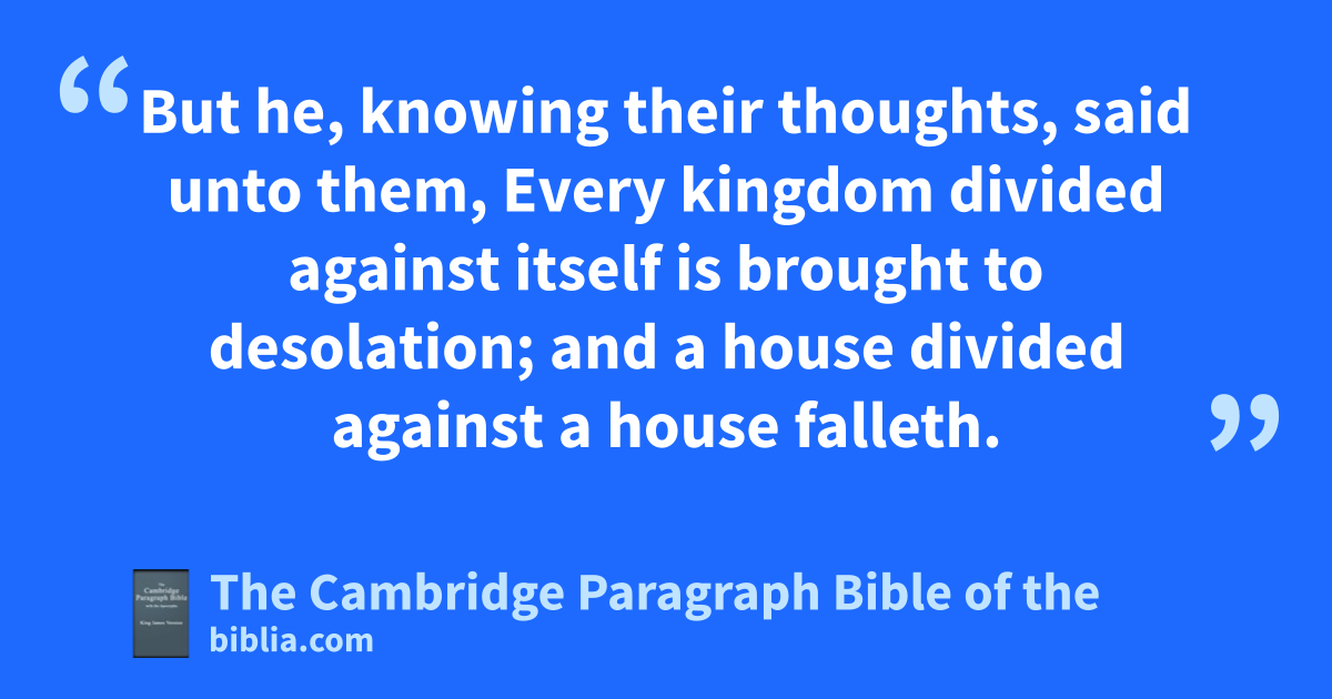 14 jAnd he was casting out a devil, and it was dumb. And it came to pass, when the devil was gone out, the dumb spake; and the people wondered. 15 But some of them said, He casteth out devils through * Beelzebub the chief of the devils. 16 And other, ktempting him, lsought of him a sign from heaven. 17 mBut he, knowing their thoughts, said unto them, Every kingdom divided against itself is brought to desolation; and a house divided against a house falleth. 18 If Satan also be divided against himself, how shall his kingdom stand? because ye say that I cast out devils through Beelzebub. 19 And if I by Beelzebub cast out devils, by whom do your nsons cast them out? therefore shall they be your judges. 20 But if I with othe finger of God cast out devils, no doubt the kingdom of God is come upon you. 21 When a strong man armed keepeth his ppalace, his goods are in peace: 22 but when a stronger than he shall come upon him, and overcome him, he taketh from him qall his armour wherein he trusted, and divideth his spoils. 23 rHe that is not with me is against me: and he that sgathereth not with me tscattereth. 24 uWhen the unclean spirit is gone out of a man, he walketh through dry places, seeking rest; and finding none, he saith, I will return unto my house whence I came out. 25 And when he cometh, he findeth it swept and garnished. 26 Then goeth he, and taketh to him seven other spirits more wicked than himself; and they enter in, and dwell there: and the last state of that man is worse than the first.