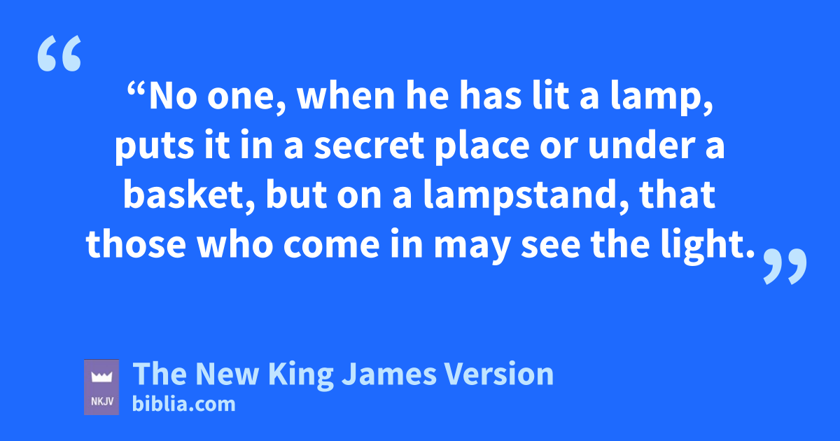 33 a“No one, when he has lit a lamp, puts it in a secret place or under a bbasket, but on a lampstand, that those who come in may see the light. 34 cThe lamp of the body is the eye. Therefore, when your eye is 9good, your whole body also is full of light. But when your eye is 1bad, your body also is full of darkness. 35 Therefore take heed that the light which is in you is not darkness. 36 If then your whole body is full of light, having no part dark, the whole body will be full of light, as when the bright shining of a lamp gives you light.”