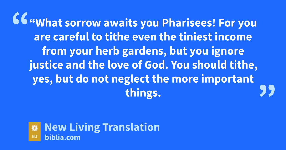 42 “What sorrow awaits you Pharisees! For you are careful to tithe even the tiniest income from your herb gardens,* but you ignore justice and the love of God. You should tithe, yes, but do not neglect the more important things.
