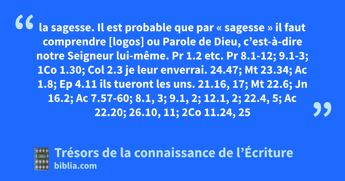 la sagesse. Il est probable que par « sagesse » il faut comprendre [logos] ou Parole de Dieu, c’est-à-dire notre Seigneur lui-même. Pr 1.2 etc. Pr 8.1-12; 9.1-3; 1Co 1.30; Col 2.3 je leur enverrai. 24.47; Mt 23.34; Ac 1.8; Ep 4.11 ils tueront les uns. 21.16, 17; Mt 22.6; Jn 16.2; Ac 7.57-60; 8.1, 3; 9.1, 2; 12.1, 2; 22.4, 5; Ac 22.20; 26.10, 11; 2Co 11.24, 25